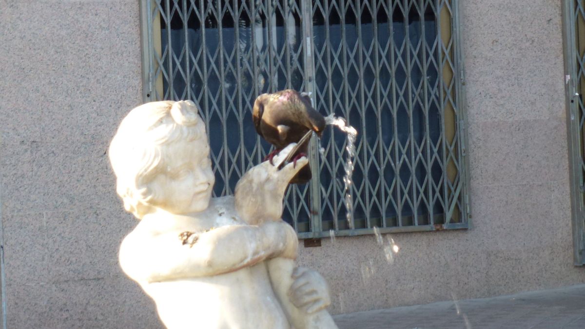När jag förbi denna staty kunde jag inte låta bli att observera denna duva som hela tiden böjde sig och tog slurkar av det utströmmande vattnet. Eftersom det finns en liten damm kring fontänen verkar det vara ett komplicerat sätt att dricka på. Är det bara för att det är kul? Eller är duvan smart, och förstår att rinnande vatten förmodligen är hälsosammare än stillastående? |