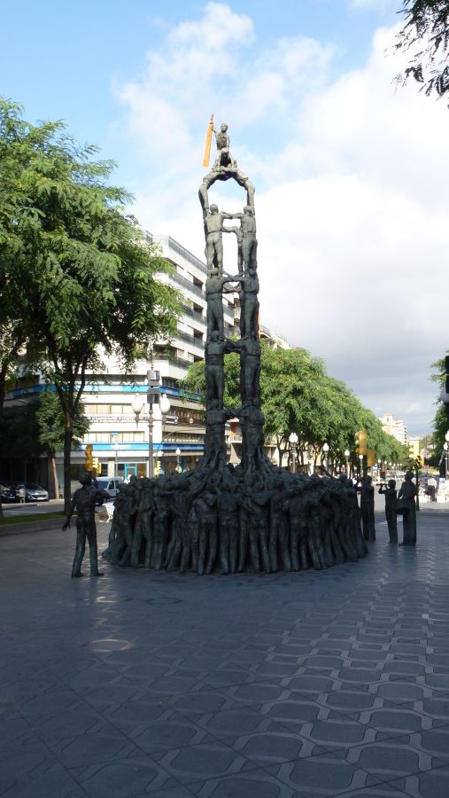 Denna staty finns ett antal kvarter in på Rambla Nova. Enligt en skylt som sitter vid statyn, så var det en gång populärt att bygga mänskliga torn (castells) i den här delen av Katalonien. Ett antal män utgjorde basen, och sedan utgjorde några andra själva tornet. Notera att figurerna som står bredvid också är en del av statyn. Några är musiker – man kan bl a se en trumma. Killen till vänster verkar bara heja på. |