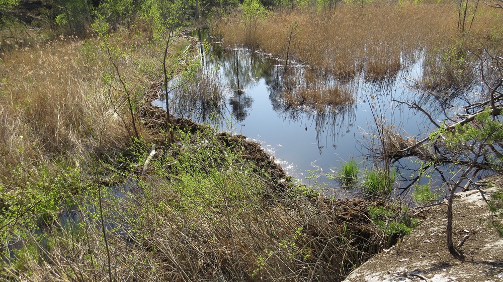 | Många sjöar man hittar i skogarna har en reglerad vattenyta. Dvs, det finns ofta någon slags fördämning vid sjöns utlopp. Så även på denna lilla göl mellan Årsjön och Stensjön i Tyrestareservatet. Men den här är inte gjord av människor. | ||
