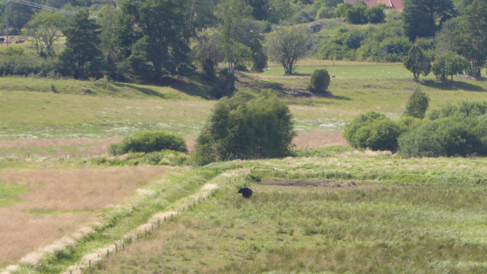 | Alla korna stod tätt samliade, utom dena svarta kon stod ensam 50-100 meter bort. Varför den inte fick, eller inte ville, vara med i gånget vet jag inte. | ||