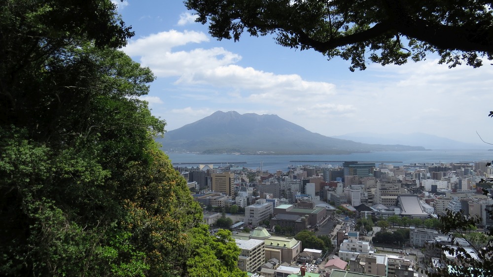 | Kagoshima är större stad nästan längst söderut på Kyushu. Tvärs över viken, på en utskjutande halvö, finns vulkanen Sakurajima. Det är en väldigt aktiv vulkan, och askmoln landar alltsomoftast på Kagoshima enligt guideboken. Dock höll sig vulkanen lugn när jag var där. | ||