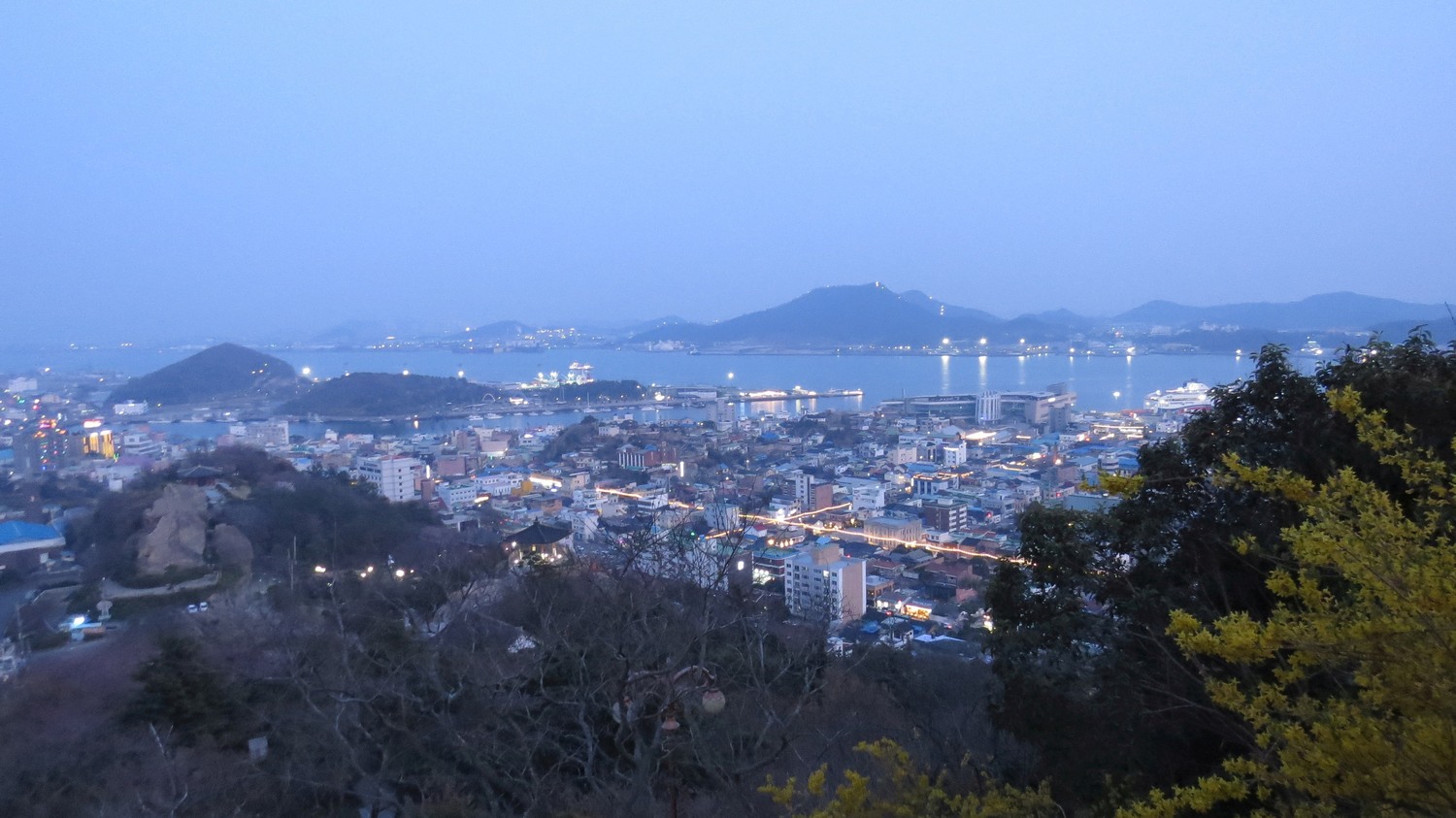 | Mokpo är stad på sydkusten. Jag åkte hit för att kunna ta båten över till Jeju, men det finns lite att se i Mokpo. Bland annat så finns ett litet berg som man kan nå från centrum och där man kan se utsikten över staden. Här strax efter solnedgången. | ||