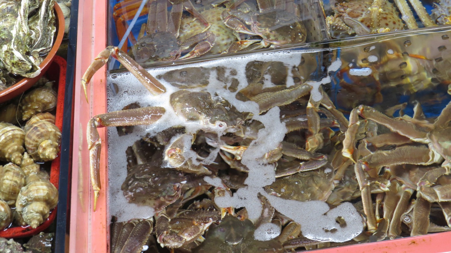 | Fiskmarknaden Jagalchi, den största av sitt slag i Korea, är definitivt en upplevelse. Det finns ett stort utbud av fisk och skaldjur här. Fast det är med blandade känslor man tittar på dessa bunkar fyllda med levande varelser i stor trängsel. Denna krabba verkar vilja fly från alltihopa. | ||