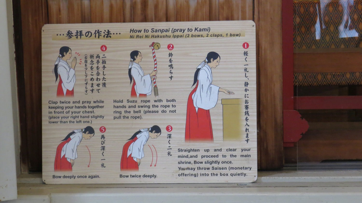 Instruktioner för hur man ber vid ett shintotempel. Notera att ordningen är från höger till vänster. Jag såg instruktioner på flera ställen, och det var lite variationer, men att buga och klappa händerna två gånger fanns alltid med. (Det talas om låda, rep och klocka i instruktionerna. Dessa saknas i föregående bild, förmodligen för att när jag tog den, så zoomade jag in på det var bakom.) |