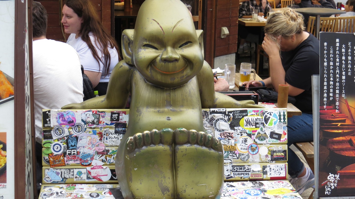 | Ett roligt område i Osaka är Shin-Sekai, ett antal kvarter runt ett radiotorn. Som med många andra torn kan man ta hissen upp för att se utsikten, men attityden här mycket mer lättsam och humoristisk än i liknande torn. Bland annat så odlar dom kulten kring Billiken, The god of how things ought to be. Man kan också se honom i kvarteren kring tornet, som här. (I Wikipedia läste jag att Billiken härstammar från Saint Louis i USA.) | ||