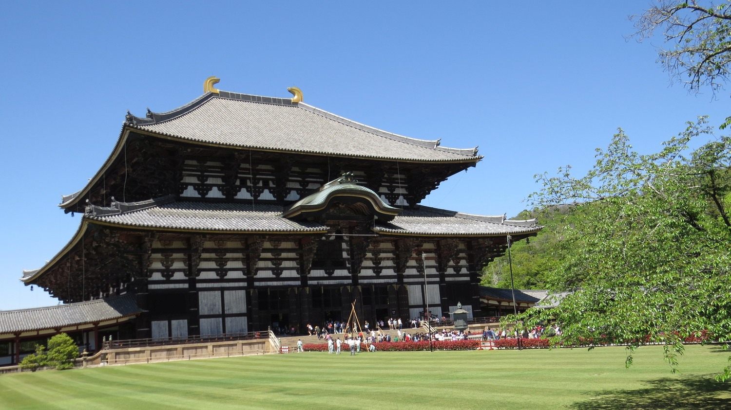 | Nara är inte långt från Osaka. Nara var huvudstad i Japan innan kejsaren flyttade till Kyoto. Detta är ett buddistiskt tempel, och denna byggnad sägs vara världens största träbyggnad. | ||