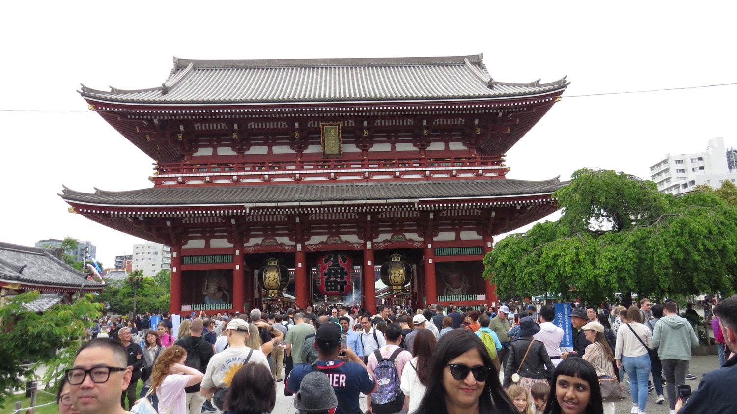 | Kaminari-mon är ingången till Senso-ji, den viktigaste buddistiska helgedomen i Tokyo. Det grundades i mitten av 600-talet, långt innan Tokyo blev maktens centrum i Japan. Som synes är det smockat med folk, och när man passerat porten är det en lång räcka av stånd med månglare som kränger souvenirer och annat. | ||