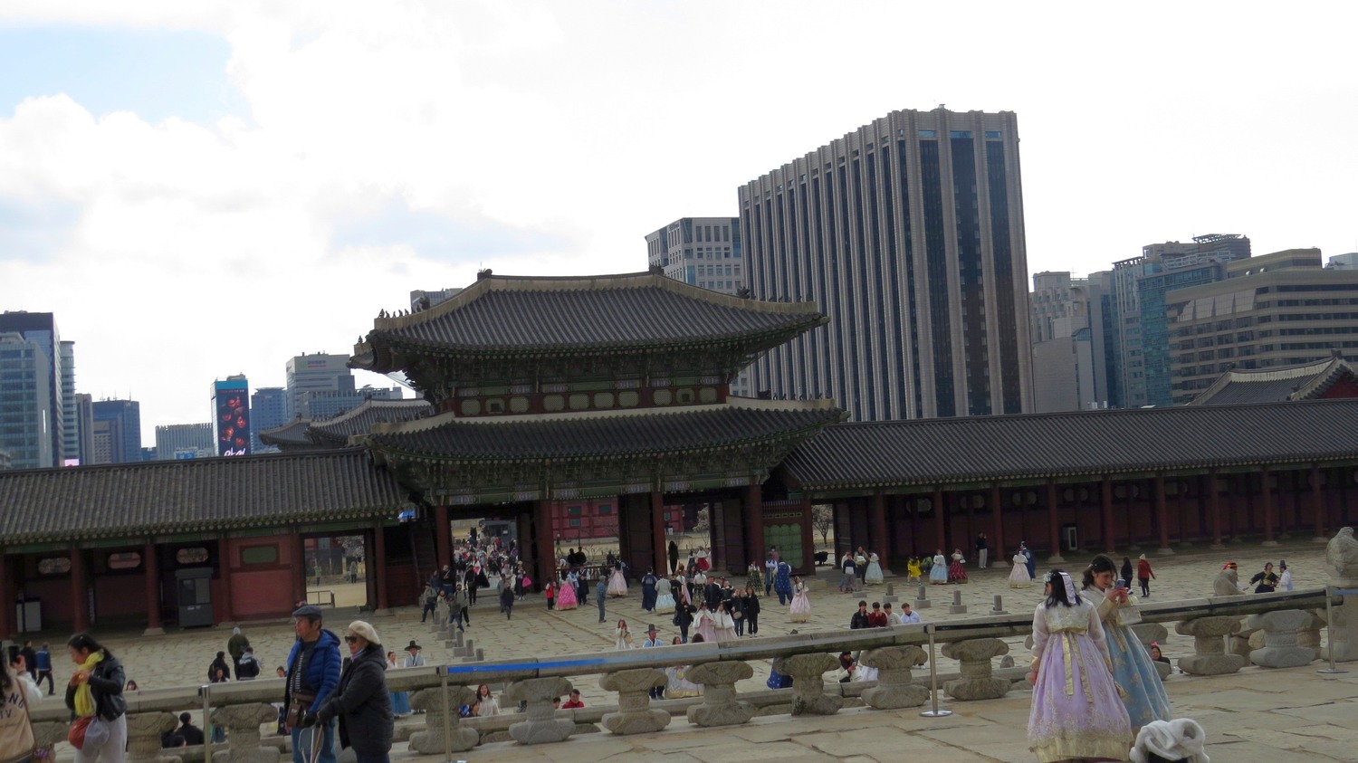 Jag tog mig ner från Inwangsan en annan väg än den jag kom upp, och till slut hamnade jag i ett bostadsområde som var rätt trevligt att passera igenom, även om det inte blev några bilder. Efter lunch kom jag fram till Gyeongbukgung genom en sidoingång. Detta är huvudingången, och som synes detta är ett populärt ställe att besöka. Notera de två kvinnorna i de långa vida klänningarna i förgrunden. De är klädda i hanbuk, en traditionell koreansk dräkt. Titta lite närmare på det övriga folkmyllret och du kommer se några till. Man kan tydligen hyra dessa för dagen, och det verkade populärt att göra så. Inte bara såg jag koreaner i hanbuk – jag såg några västerlänningar också. |