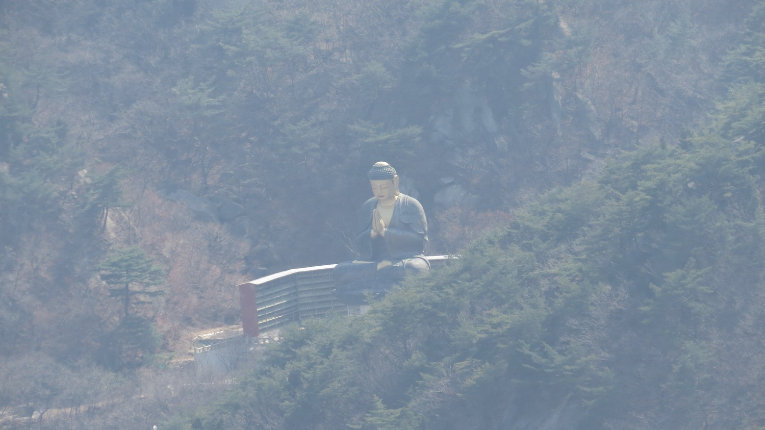 | I fjärran såg jag något som inte passade in i bergslandskapet. Jag zoomade in med min 50X-kamera. Även om det var en solig dag, var det ändå dis på håll, så bilden är lite dimmig. Men det ser ut som att det är Budda-staty på bergssidan. | ||