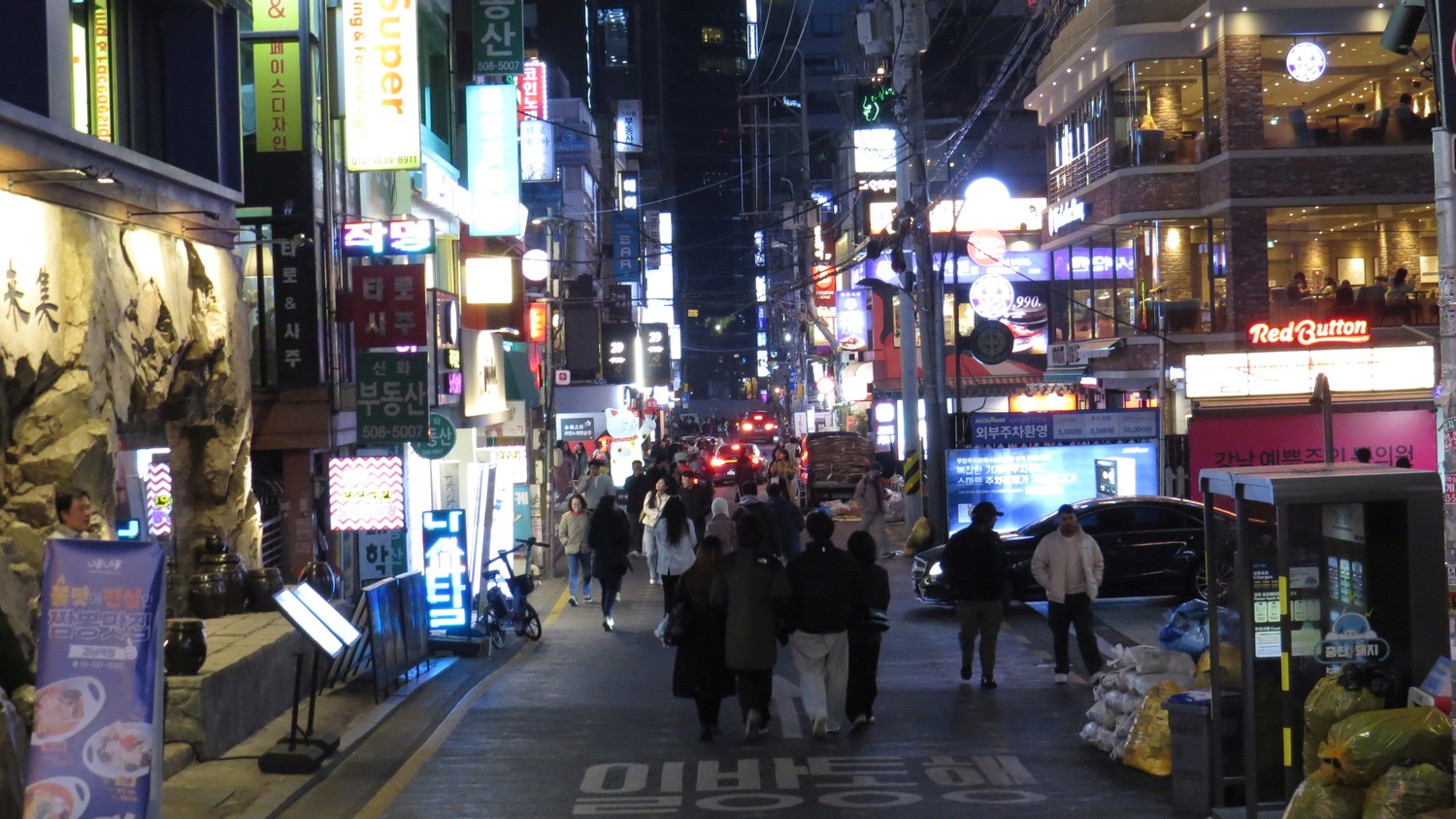 | Om man hoppar in ett kvarter från Gangnam-daero, hamnar man på en mindre gata med ett virvlande folkliv bland alla restauranger och barer. Seoul som bäst! | ||