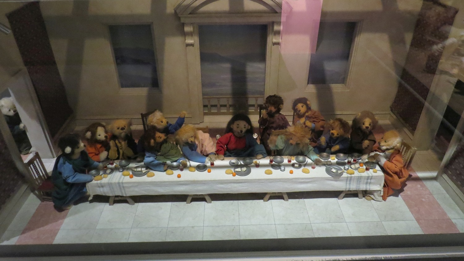 Det finns också flera parafraser på kända konstverk med teddybjörnar i huvudrollen. Här Leonardi da Vincis "Nattvarden".