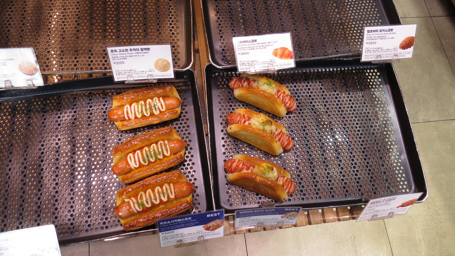 | Mitt hotell i Jeju serverade inte frukost, så jag intog min frukost på Paris Baguette, en kafé/bageri-kedja som finns överallt i Sydkorea. När jag först såg dessa, förleddes jag av glasyren att tro att de var söta. Men när jag sedan tog en sådan till frukost smakade det som varmkorv brukar smaka. | ||