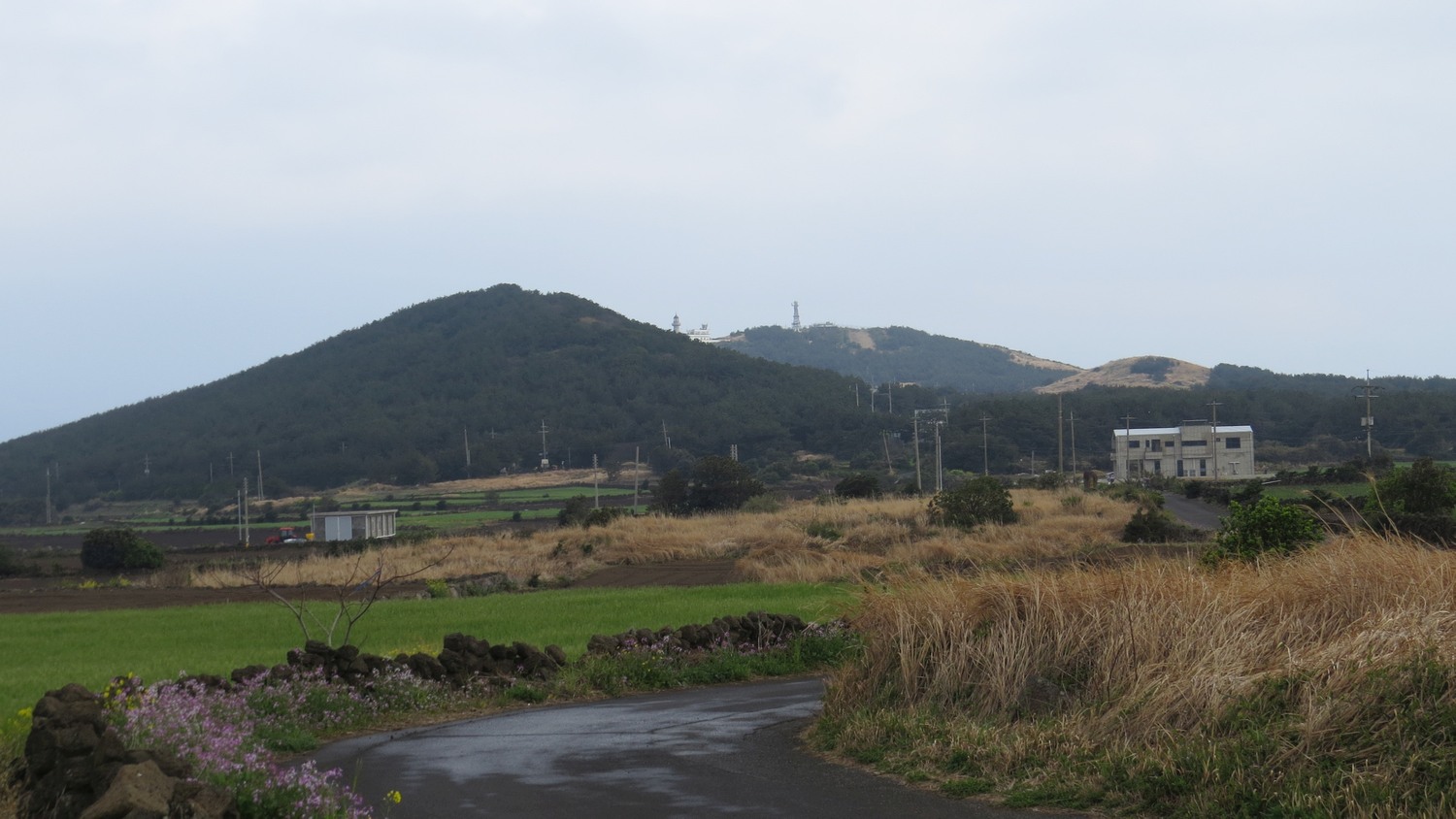 Det finns ett mindre berg i ena ändan av Udo, men vandringsleden gick inte upp på berget. Det går kanske se på asfalten att det regnade då och då.