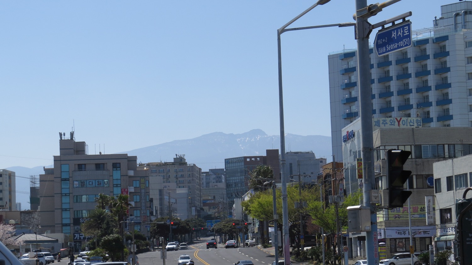 De första dagarna på Jeju såg jag inte ett spår av Hallasan, etersom berget var dolt av molnen, men denna dag kan jag se berget inifrån stan.