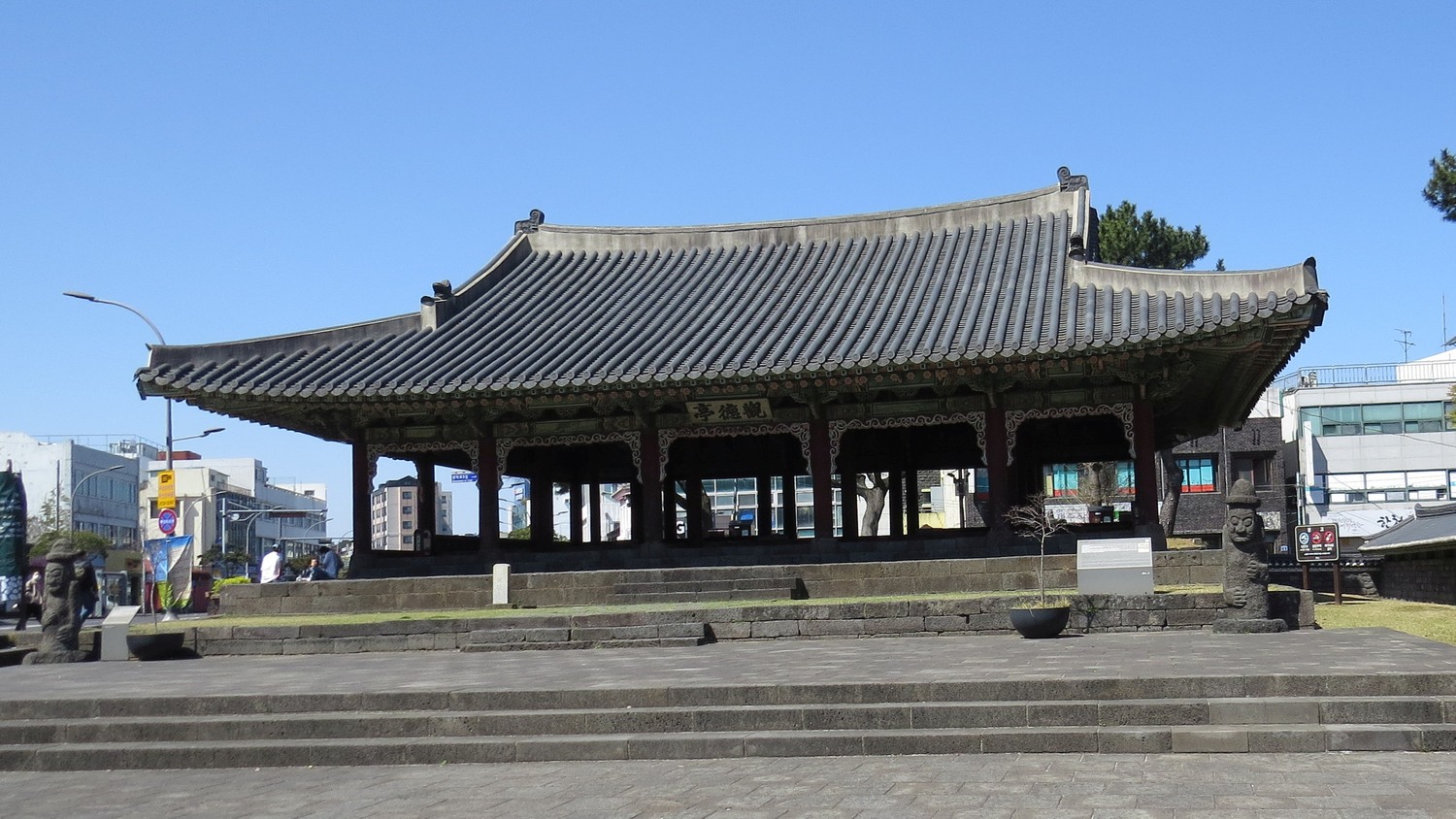 Denna paviljon är just utanför Jeju Mokgwana. Observera de två farfarsstatyerna på vardera ändan av paviljongen.