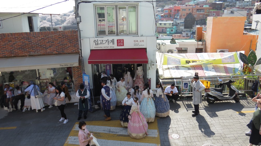 Jag sitter på ett kafé i Gamcheon och tittar på turister som prövar hanbok i hyresaffären på gatan nedanför.