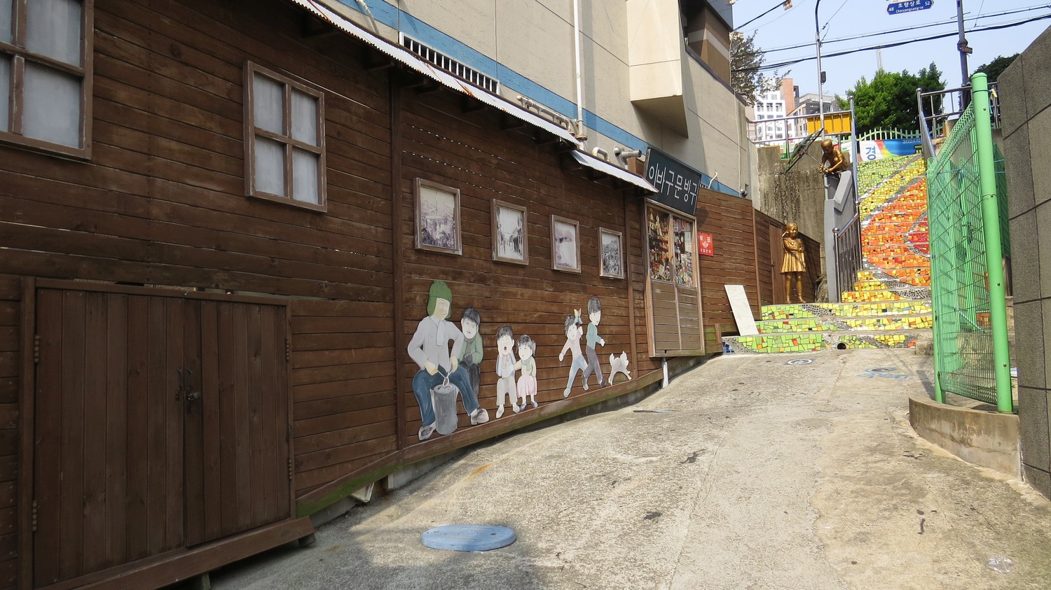 | Japanfärjan skulle inte gå förrän till kvällen, så jag hade några timmar för att titta på Busan nästa dag. Jag passerade kvarteren för Shanghai/Texas street för att komma upp en bit på berget. Det är då jag passerar dessa figurer. Jag vet inget om dem, eller om bronstatyerna av barnen i bakgrunden. | ||