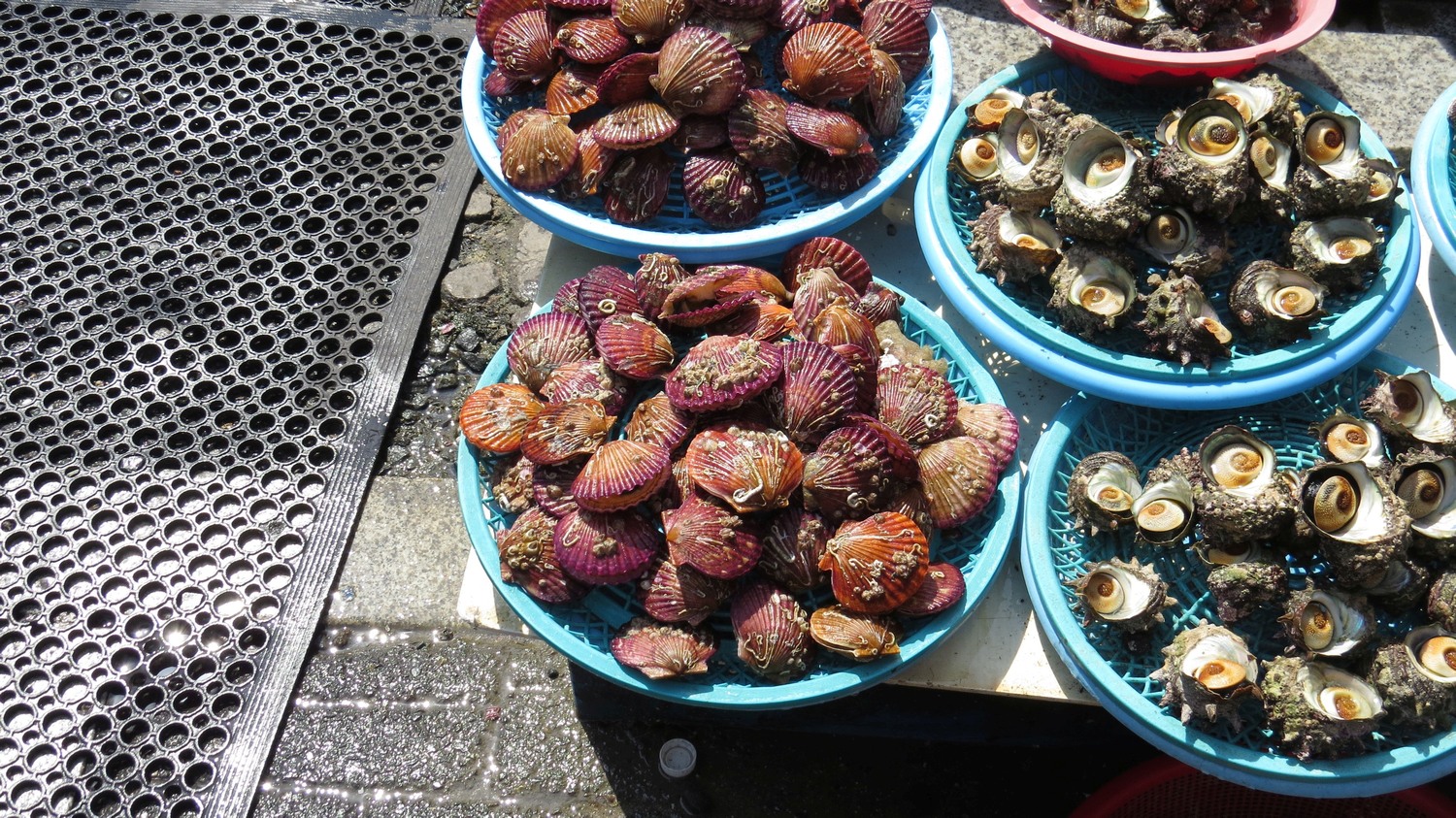 Man får anta att dessa musslor och snäckor är döda, eftersom det inte finns något vatten. Dessa såldes på gatan utanför själva marknaden.