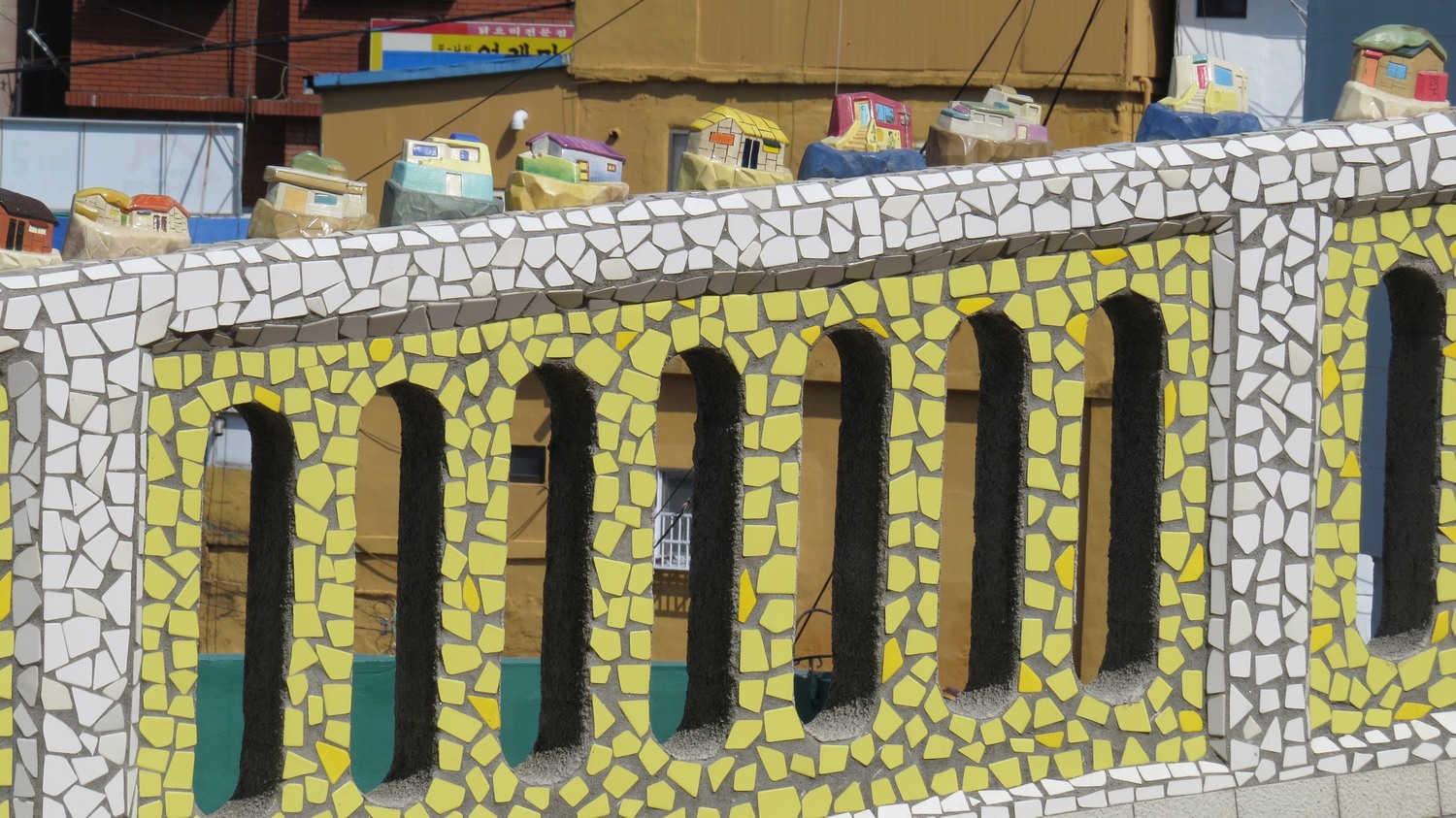 | Jag är på väg till Gamcheon Culture Village, ett bostadsområde som har blivit en populär turistattraktion på sistone. Dekorationen på broräcket kan vara inspirerat av Gamechon som mestadels består av småhus. | ||