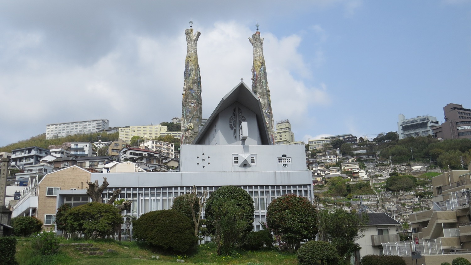 | Till minnesmärket hör också en kyrka som arkitektonisk är en osannolik blandning av grå betong för nederdelen och två fantasifulla torn, som verkar vara inspirerade av Antoni Gaudì. | ||