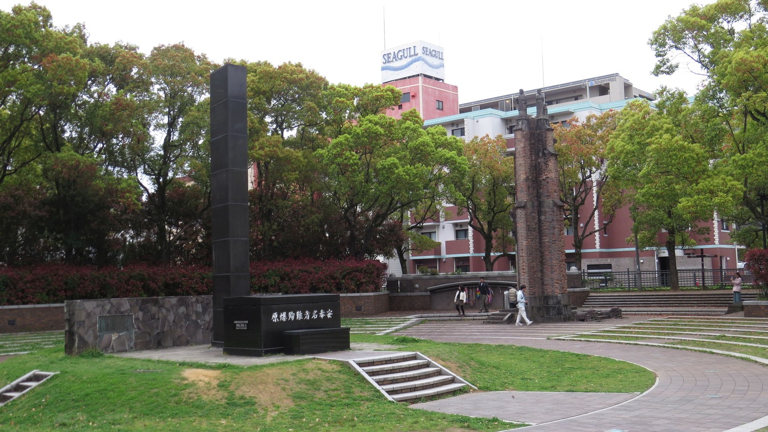 | Den svarta pelaren i mitten markerar den exakta platsen där bomben exploderade, 500 meter upp i luften. Den röda tegelpelaren till höger är en rest från den gamla Urakami-katedralen. | ||
