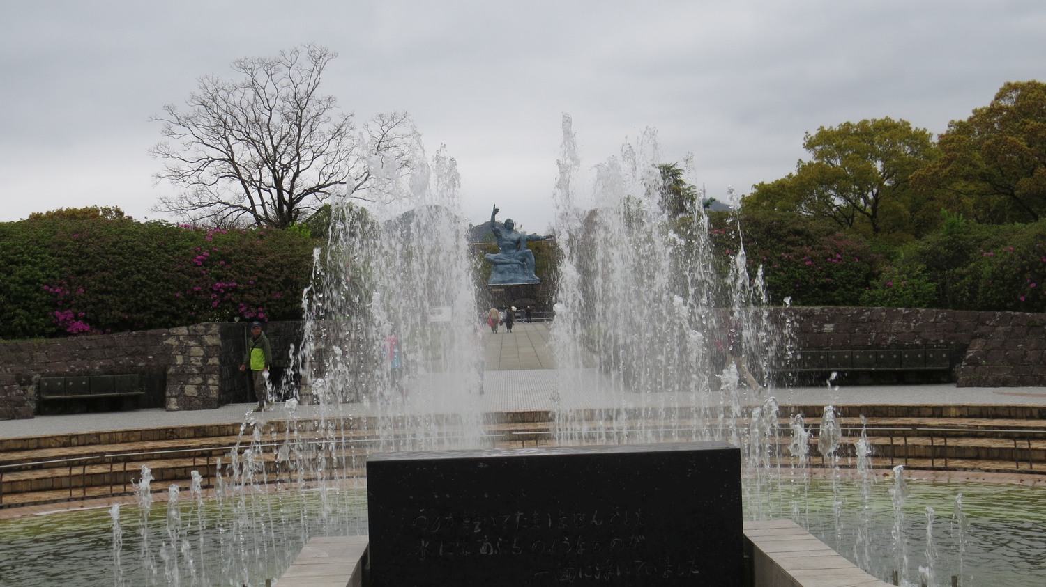 En bit bort är Fredsparken där det finns en samling statyer och minnesmärken. Den mest prominenta är fredsstatyn, som syns genom fontänen.