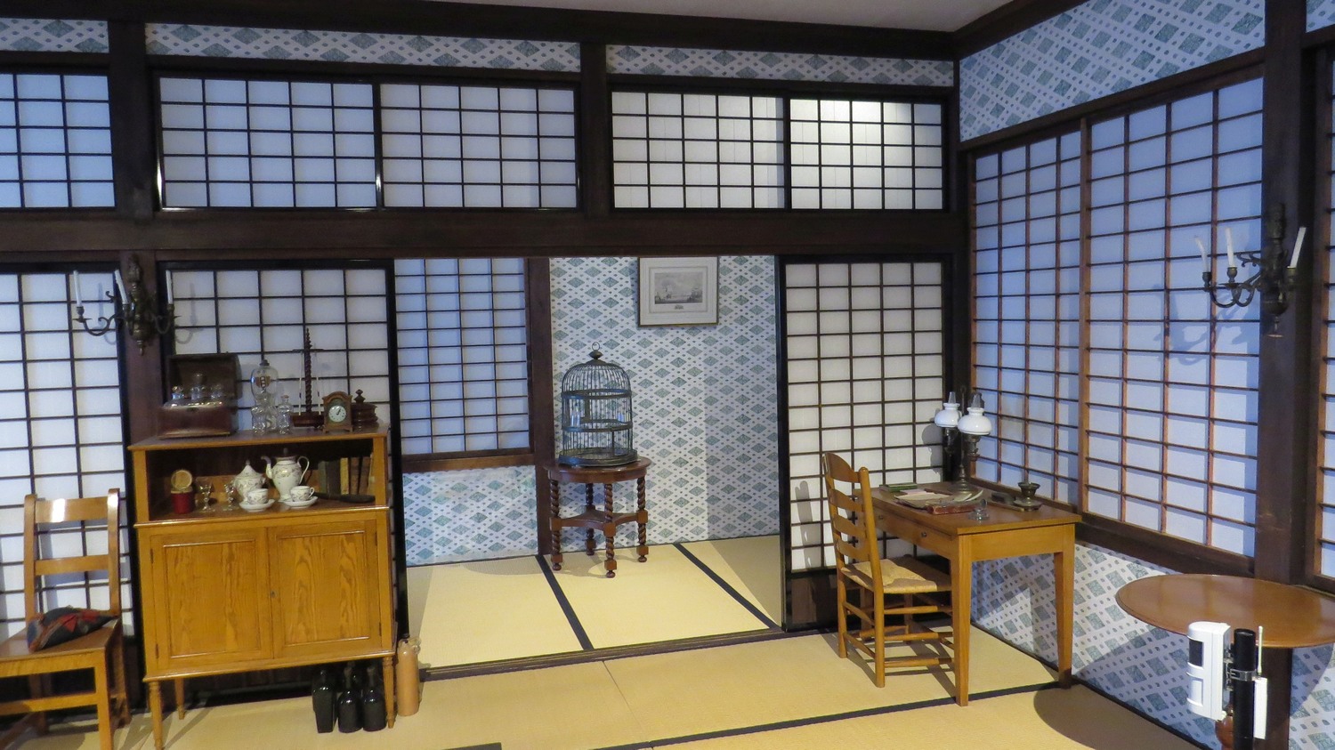 Husen i Dejima byggdes ofta av lokala arbetare, vilket kan förklara blandningen av japanskt och europeiskt. Pappersväggar och tatamigolv är typiskt japanska, men möblerna är europeiska. |