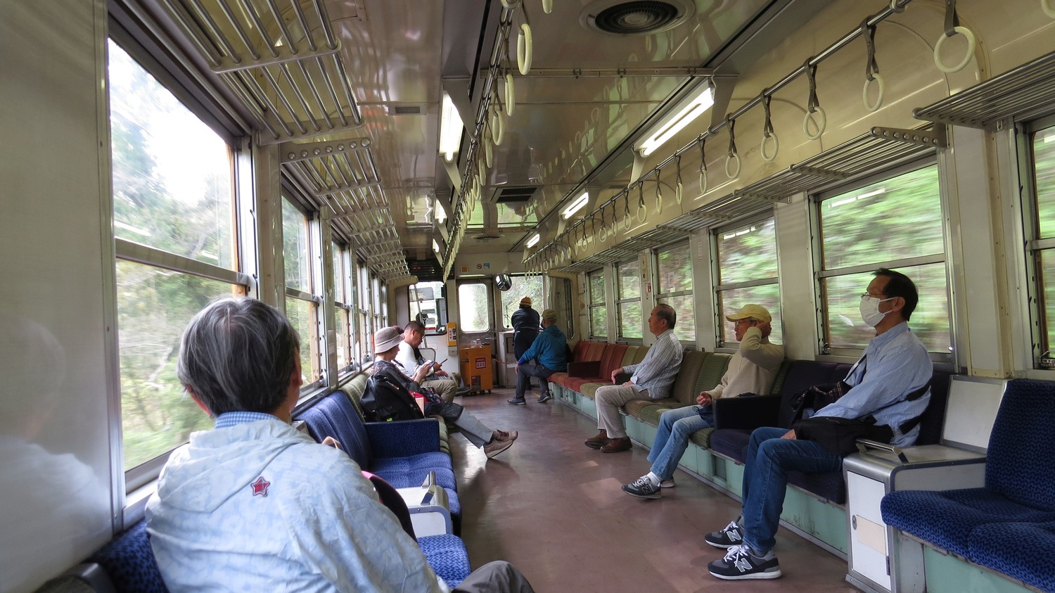 | Den här inredningen med bara säten längs sidorna och en massa ringar för stående passagerare att hålla sig i är det normala för ett lokaltåg i Tokyo, men här ute i Shikokus glesbygd, ser det minst sagt udda ut. En annan sak att notera är att det inte finns någon toalett på tåget. | ||