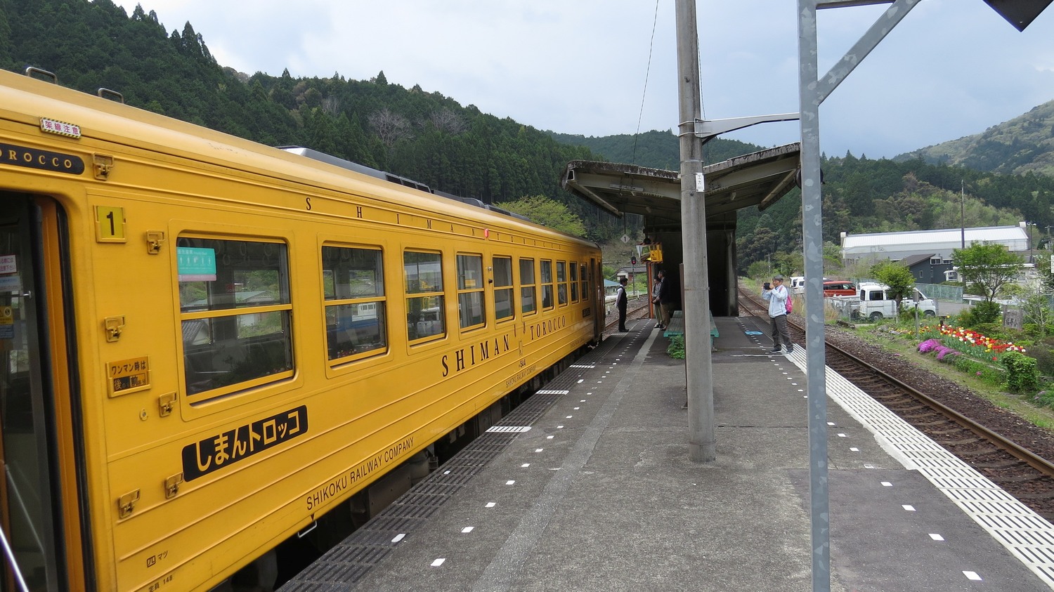 | Vi har stannat till i Tosa-Taisho. Vi stod här 15-20 minuter. Jag kan inte minnas att vi mötte något annat tåg, vi liksom bara tog en paus, så att vi kunde på toaletten och så. Vagnen till vänster är alltså tåget jag åkte med. | ||