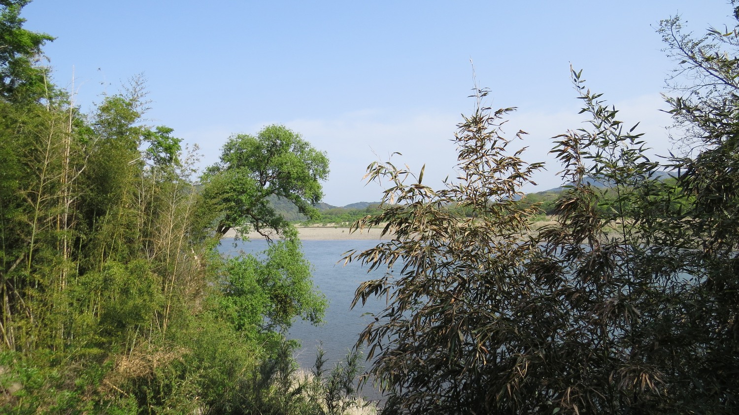 | Cykelturen verkade först inte vara någon succé. Det tog ett tag innan jag hittade genom staden till floden, och när jag kom fram till den, så var den först gömd bakom höga flodbankar. När jag fortsatte uppströms var floden skymd av träd. Men till slut blev det en lucka, och jag kunde se en glimt av floden mellan träden. | ||