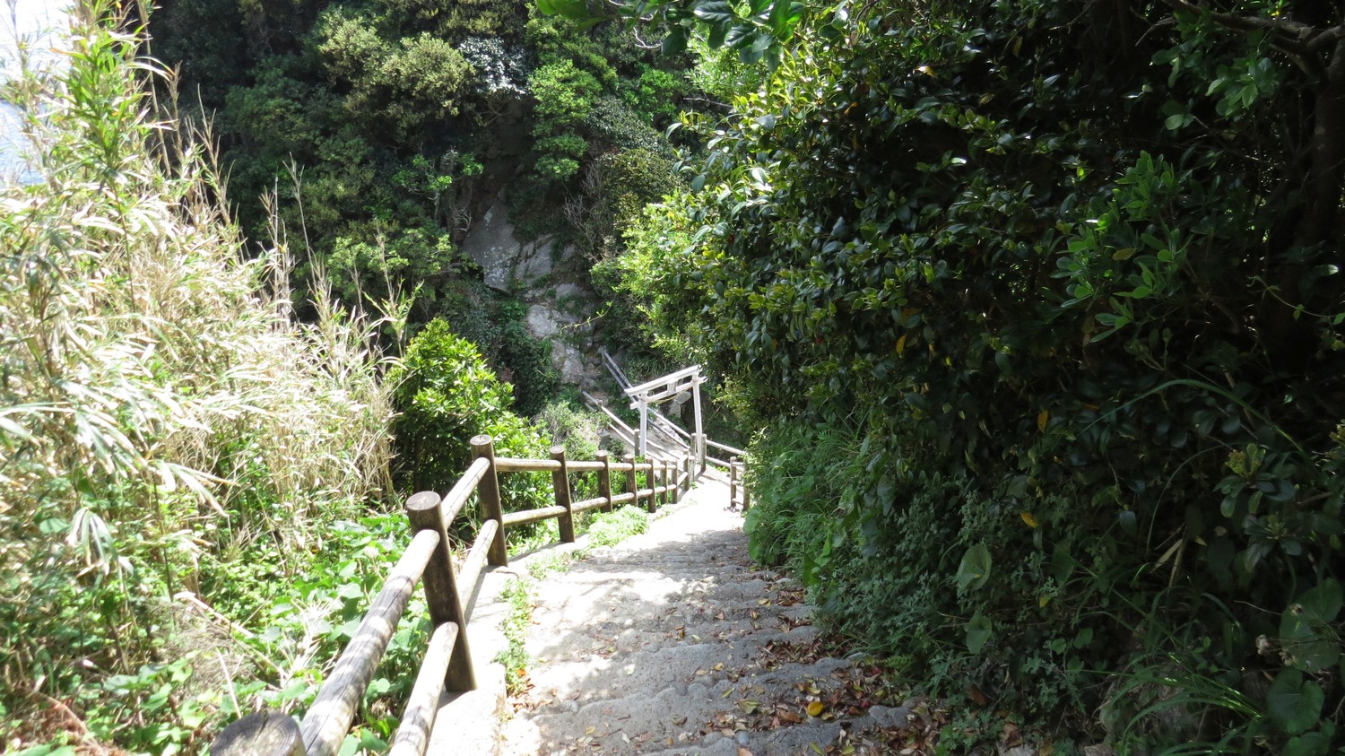 En trappa ner till stranden framför portalen. Notera toriin som markerar ingången till helgdomen uppe på bågen.