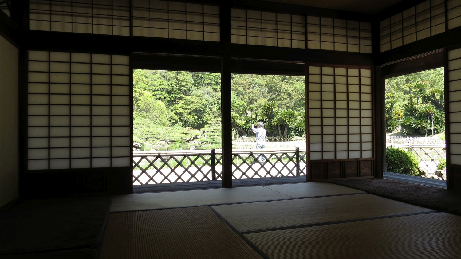 | Som i många japanska parker, så finns det ett tehus. Jag gick in och beställde matcha-te med sötsak. Efter teet var jag på väg ut, men då sa en kvinna: "Ska du inte se resten av tehuset?" Det visade sig att det handlade inte bara om interiören, utan man fick också andra vinklar på parken inifrån tehuset. Så här följer ett antal bilder tagna från tehuset. | ||