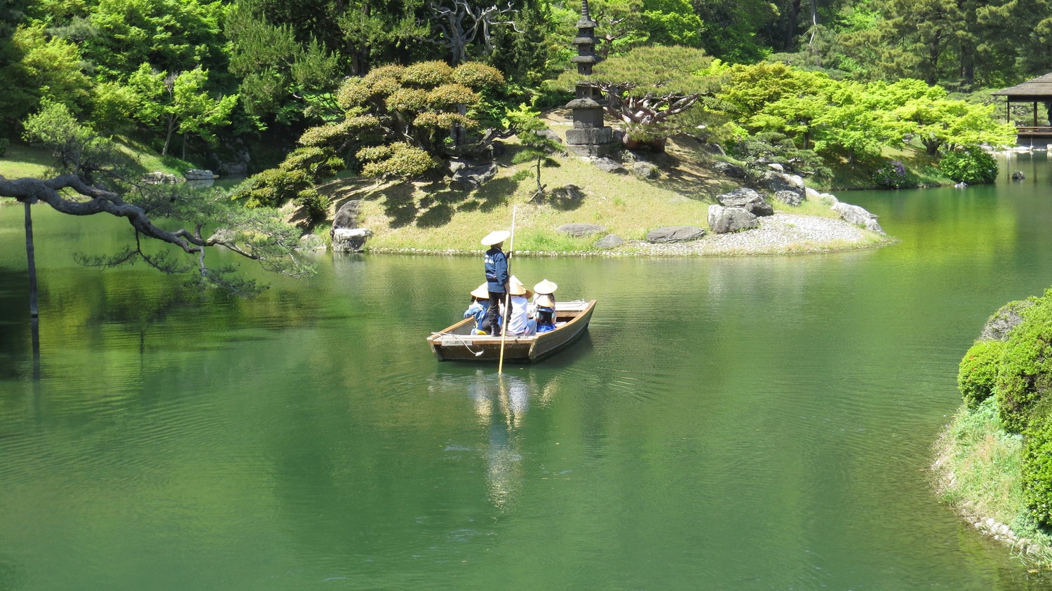 | Man kan också åka på en båttur i den största dammen, och jag gjorde det senare. Alla i båten har en stråyhatt. Vi blev tillsagda att göra det för att skydda oss från nerfall från fåglarna i parken. | ||