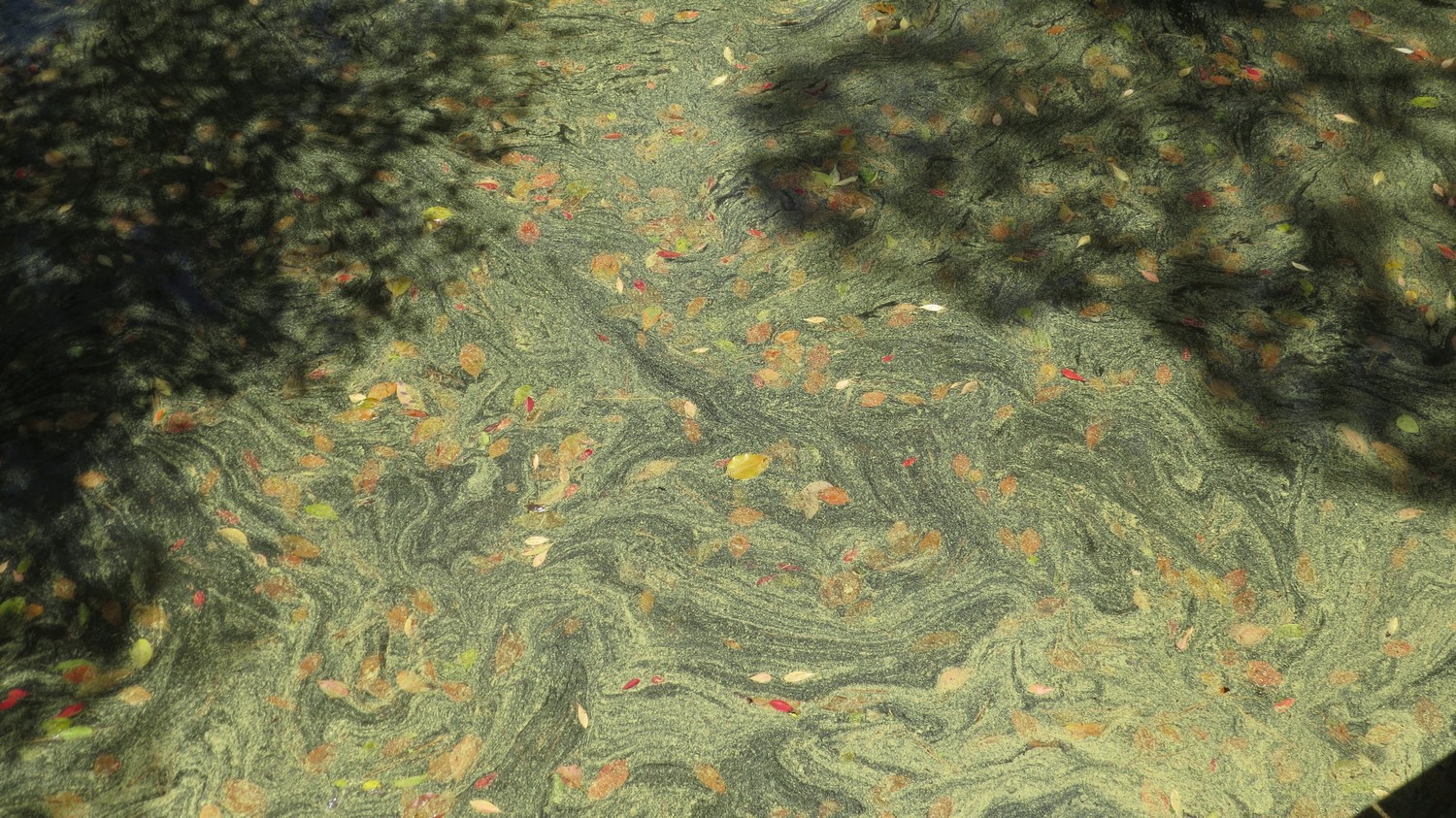 Vi går ombord på den lilla båten i en liten vik av den stora dammen där pollen och små blad har samlats.