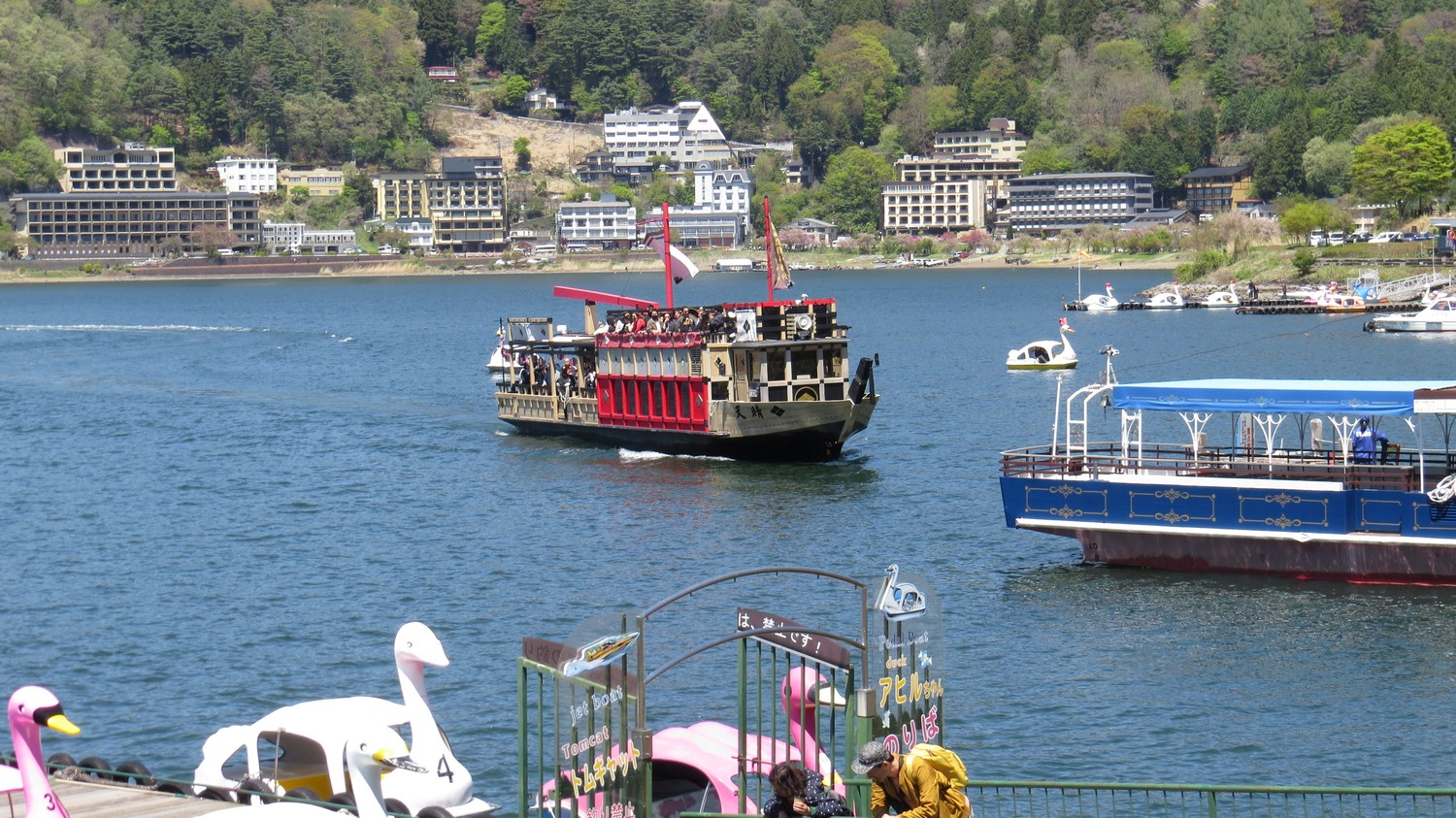 Det finns också större båtar som man åka en tur med för att se sjöns omgivningar från vattnet. Och, förstås, Fujisan.