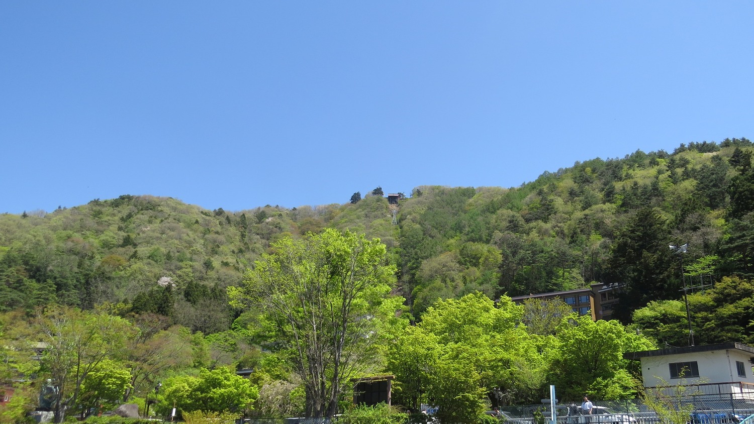 | Tenjo-zan är ett berg som sticker upp precis bakom den lilla hamnen för turbåtarna. Det går kanske se att det finns en linbana, och jag kommer ta den uppför berget. | ||