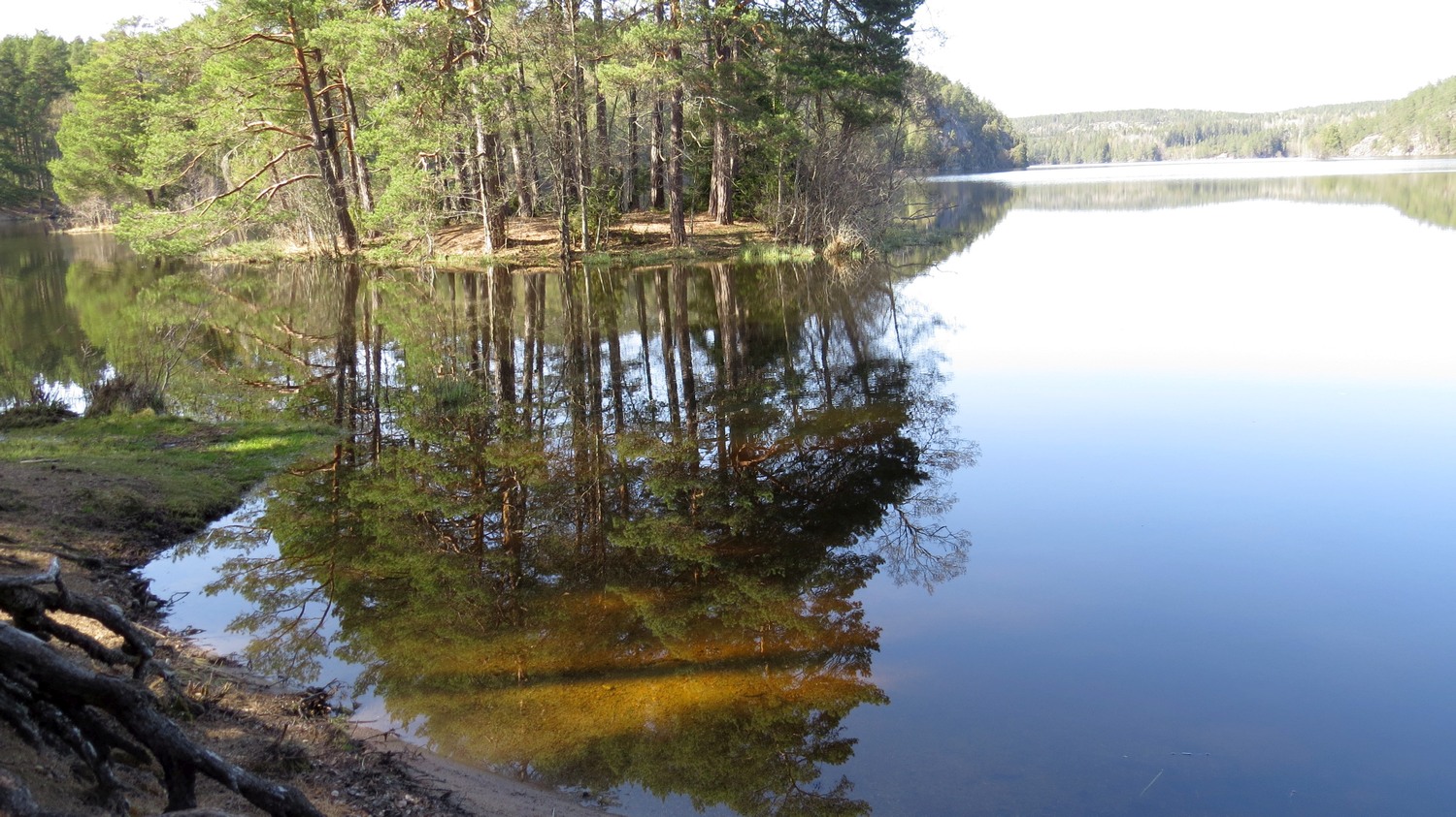 Här jag vid Stor-Marvikens övre ända i sydöst, vid näset som skiljer den från Övre Marviken. Det finns en liten badplats här, men så här års var det inte så många som badade. (Jag tog dock ett sanbbt dopp senare, mot slutet av vandringen.) |