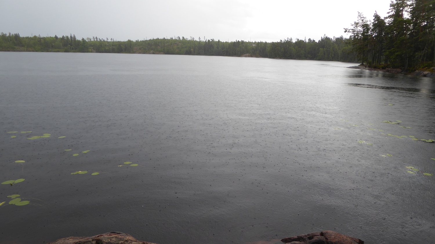 | Vandringen började i vackert väder, och jag fick några njutningsfulla timmar vid Långsjön i solen. Men precis som prognosen utlovat drog molnen in och det kom en regnskur. Jag har varit vid Stensjön många gånger, men att se den i regn var en ny upplevelse. | ||||