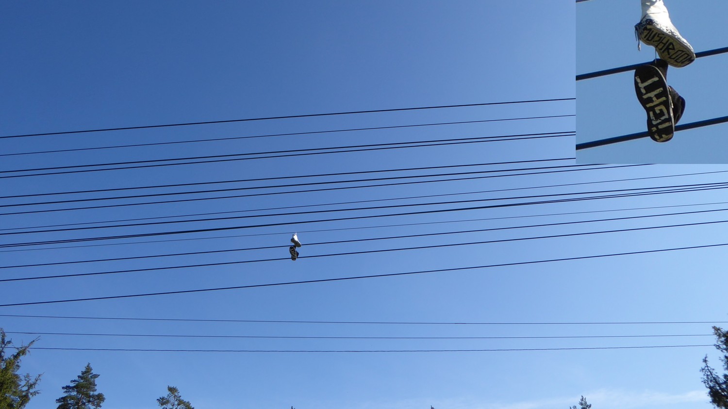 | Årets sista långcykeltur. När jag körde under den här kraftledningen mitt ute i terrängen, så noterade jag att kastat upp ett par skor på ledningarna. (Det hängde åtminstone ett par skor till lite längre bort.) Det blir inte mindre bizarrt när någon skrivit orden Fight och Mushroom på sulorna. | ||||