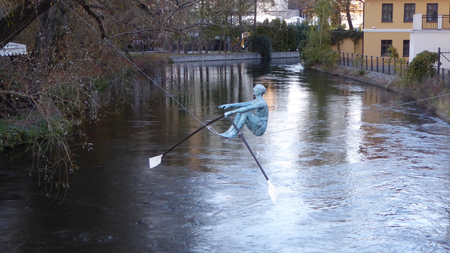 Det finns ett antal statyer som hänger i vajrar över vattnet i floden. Alla föreställer personer som utför någon aktivitet relaterad till vatten.